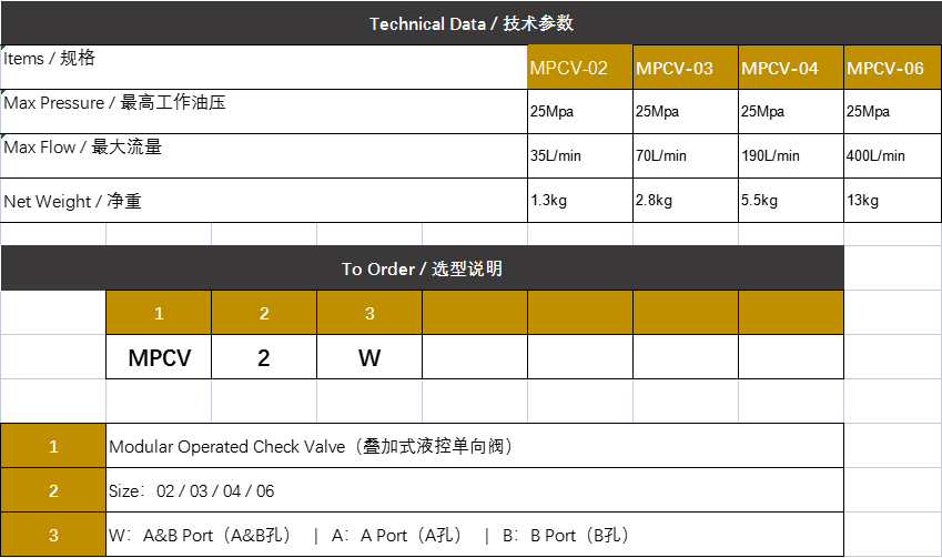 Rheoli Cyfeiriadol Modiwlaidd Gwirio Falf Hydrolig MPCV-02W MPCV-03W